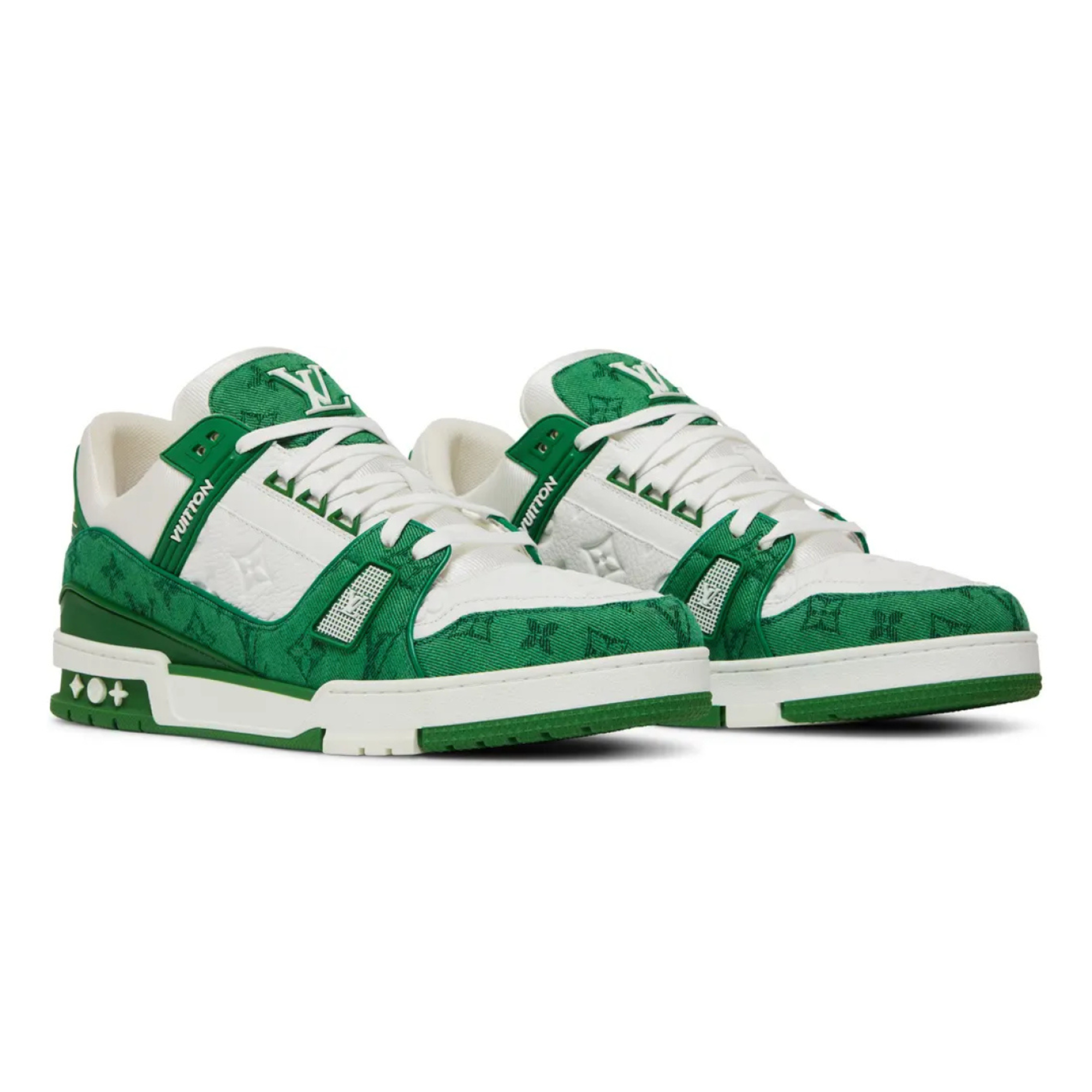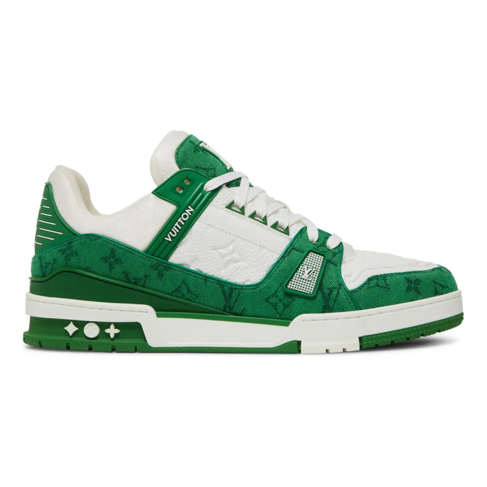 The Louis Vuitton Trainer in Green Monogram Denim White reinvents a house classic with bold color and contemporary texture. Blending the Maison’s iconic monogram with a vibrant green denim finish and crisp white accents, this design brings a fresh, youthful energy to the silhouette first introduced by Virgil Abloh.