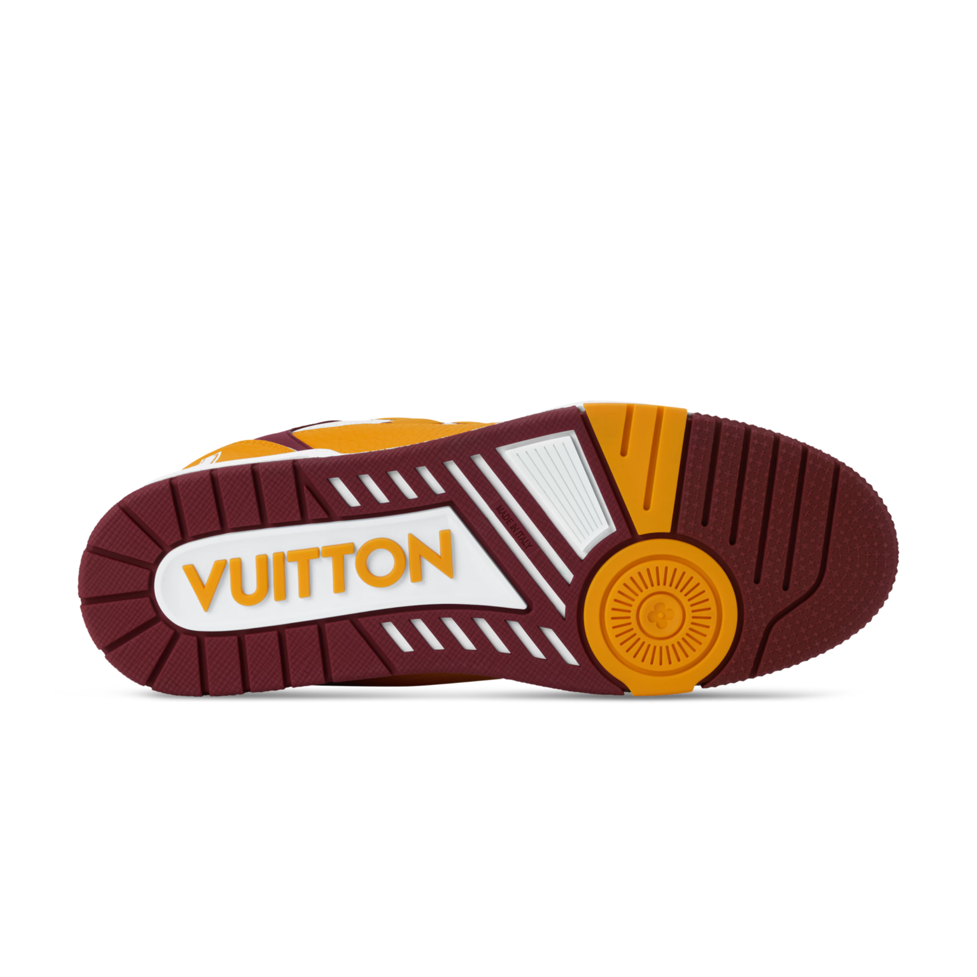 The iconic LV Trainer sneaker is reimagined in vibrant yellow perforated calf leather, drawing inspiration from vintage college sports aesthetics. This updated edition retains the silhouette’s signature layered construction and introduces bold contrasts and detailed embellishments.